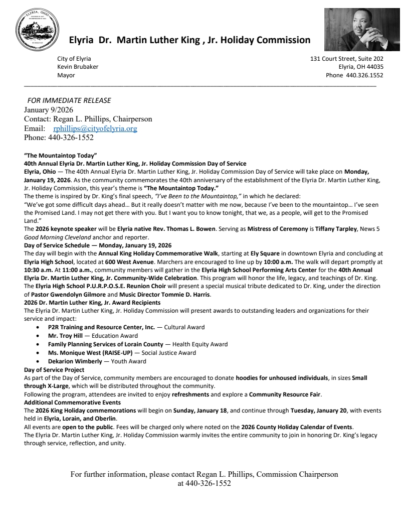 The 40th Annual Elyria Dr. Martin Luther King, Jr. Holiday Commission Day of Service will take place on Monday, January 19, 2026. As the community commemorates the 40th anniversary of the establishment of the Elyria Dr. Martin Luther King, Jr. Holiday Commission, this year’s theme is “The Mountaintop Today.”