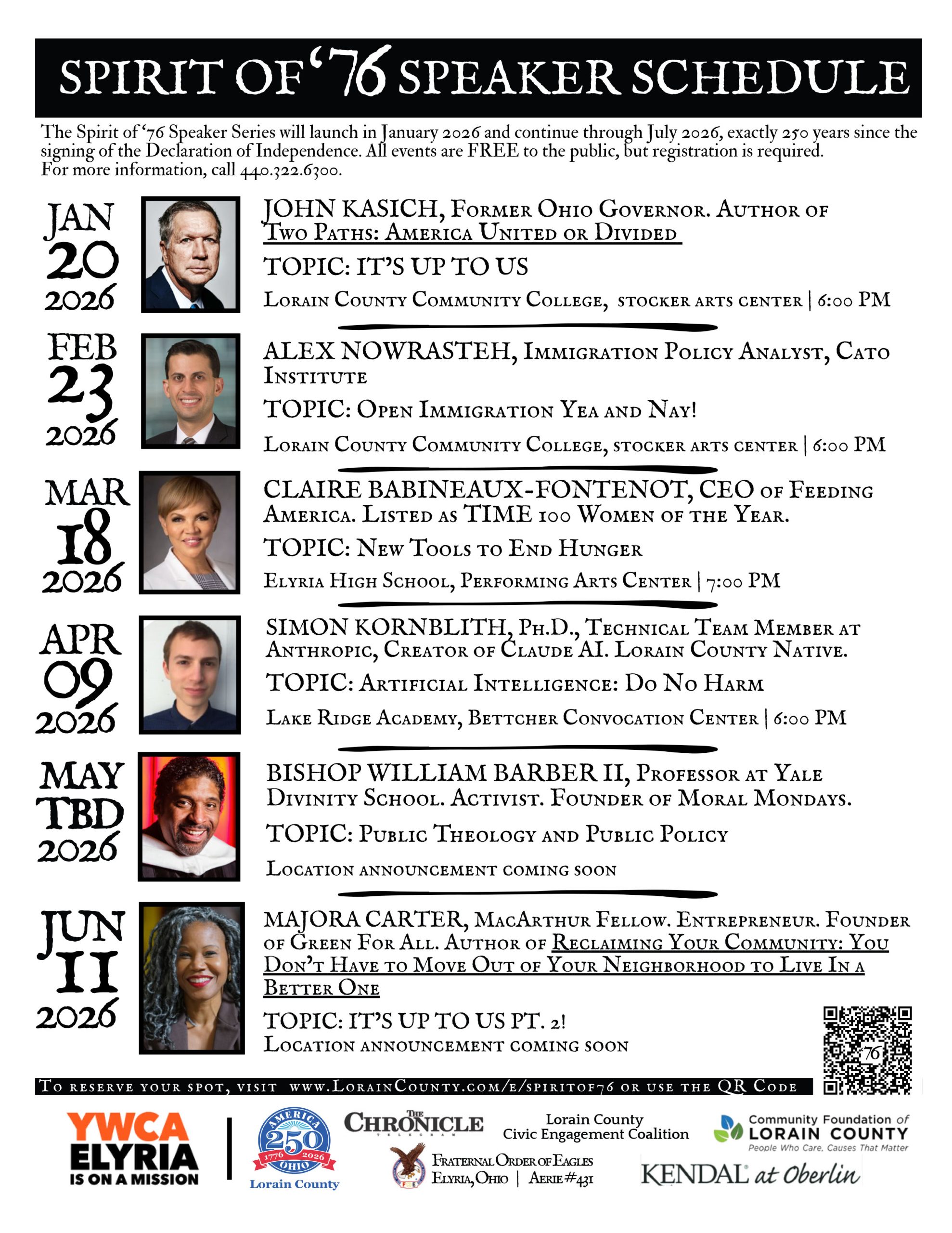 The Spirit of ‘76 Speaker Series will launch in January 2026 and continue through July 2026, exactly 250 years since the signing of the Declaration of Independence. All events are FREE to the public, but registration is required. For more information, call 440.322.6300.